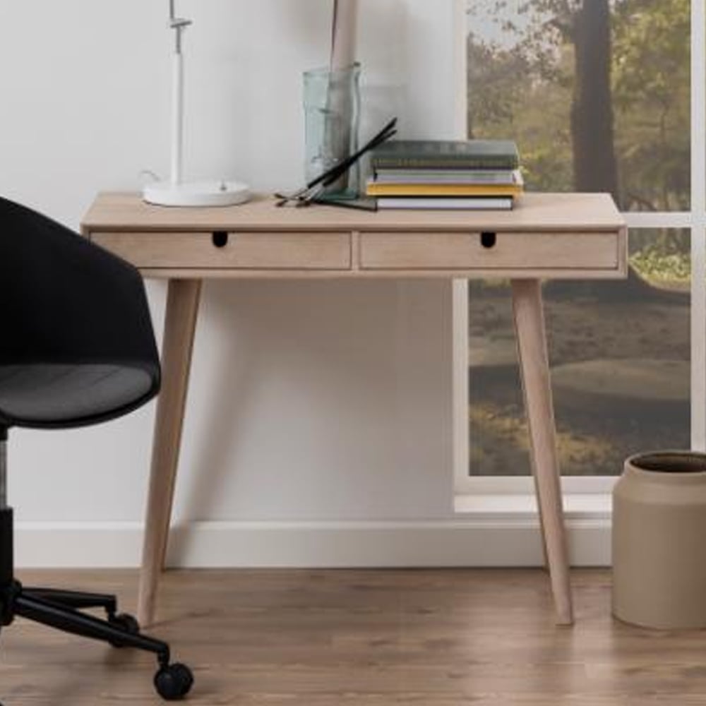 Bring functionality and natural charm to your workspace with the Furniture in Fashion Canton Wooden Laptop Desk with 2 Drawers in White Oak. Beautifully crafted with a sleek, minimalist silhouette, this desk features a clean white oak finish that blends seamlessly into both modern and classic interiors. Whether you’re setting up a home office, study area, or multipurpose workstation, the Canton Desk offers a stylish yet efficient solution. Designed for everyday use, this compact desk provides ample workspace for laptops, notebooks, and accessories, while the two spacious drawers keep your essentials organized and within easy reach. The durable build and smooth finish ensure long-lasting use, making it an ideal addition to your home or office setup. The Furniture in Fashion Canton Wooden Laptop Desk with 2 Drawers in White Oak is a perfect fusion of practicality and elegant design. Offering a functional workspace and clever storage in a compact form, its the ideal desk for anyone looking to elevate their productivity in style. FEATURES : Material : Wooden Finish : White Oak With roots in Scandinavian design, this desk is designed to become a modern classic Defined by clean lines and a minimalistic look, it features 2 drawers in white pigmented oak veneer for your essentials The angled round legs made of oak keep the desk steady It is an aesthetically pleasing design with practicality in mind Desk boasting a minimalistic look and clean lines White pigmented oak and oak veneer surface Features 2 drawers for essentials Spacious desktop perfect for laptops, writing, or creative tasks Includes two drawers for storing stationery, documents, or gadgets Minimalist design suits modern, Scandinavian, and traditional interiors Sturdy legs and solid frame ensure lasting stability Compact size ideal for smaller rooms or apartments Available at an affordable price Images shown are for illustration purpose only DIMENSIONS : Height : 74cm Width :